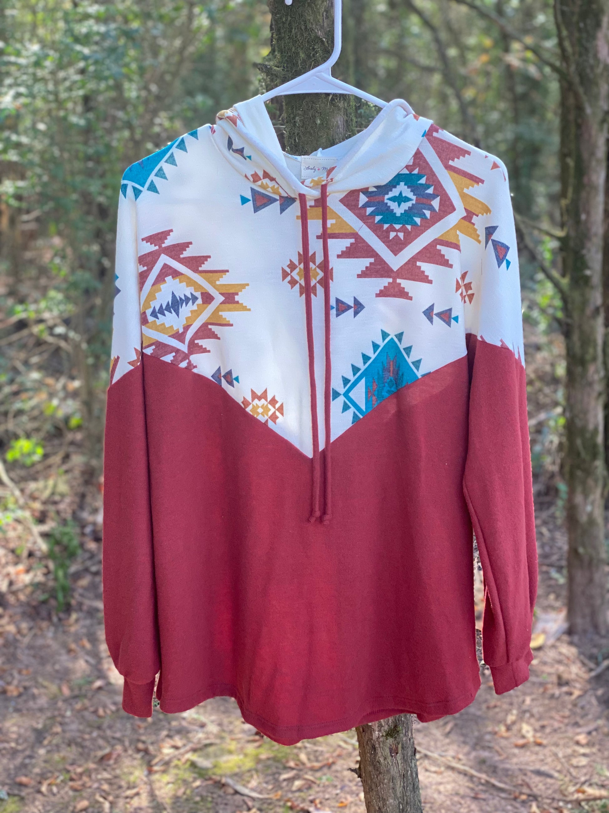 Burgundy and cream pullover with Aztec print & hood. True to size.